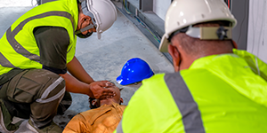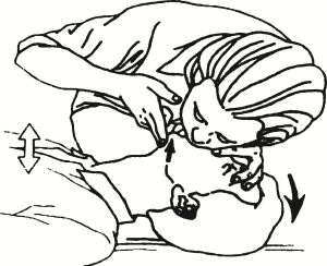 如患者無呼吸,立即進(jìn)行口對(duì)口人工呼吸。摸頸動(dòng)脈,如果能感覺到搏動(dòng),那么僅作人工呼吸即可。為防止細(xì)菌感染,采用接口套,用酒精消毒。施救者一手捏住患者鼻子,大口吸氣,屏住,迅速俯身,用嘴包住患者的嘴,快速將氣體吹入。與此同時(shí),施救者的眼睛需觀察患者的胸廓是否因氣體的灌入而擴(kuò)張,氣吹完后,松開捏著鼻子的手,讓氣體呼出,這樣就是完成了一次呼吸過程。每分鐘平均完成12次人工呼吸。