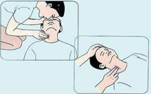 開放氣道應(yīng)先去除氣道內(nèi)異物。如無頸部創(chuàng)傷,清除口腔中的異物和嘔吐物時(shí),可一手按壓開下頜,另一手用食指將固體異物鉤出,或用指套或手指纏紗布清除口腔中的液體分泌物。