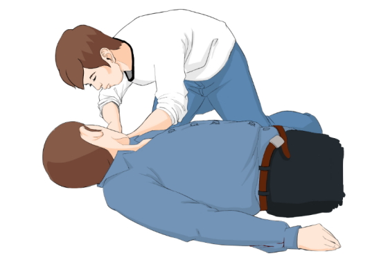 ? ? ? ?如患者無呼吸,立即進行口對口人工呼吸。摸頸動脈,如果能感覺到搏動,那么僅作人工呼吸即可。為防止細菌感染,采用接口套,用酒精消毒。施救者一手捏住患者鼻子,大口吸氣,屏住,迅速俯身,用嘴包住患者的嘴,快速將氣體吹入。與此同時,施救者的眼睛需觀察患者的胸廓是否因氣體的灌入而擴張,氣吹完后,松開捏著鼻子的手,讓氣體呼出,這樣就是完成了一次呼吸過程。每分鐘平均完成12次人工呼吸。
