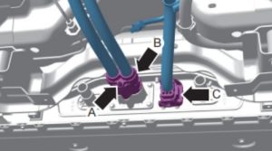 ②使用T25 花形旋具套筒旋松電池高壓線束連接插頭固定螺栓(箭頭A)